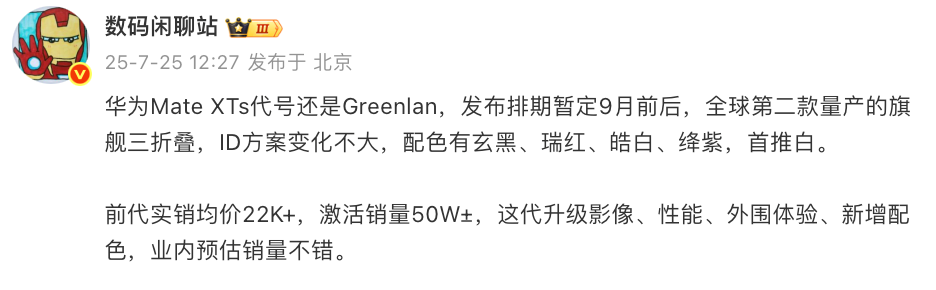 据爆料达人数码闲聊站透露,华为新款三折叠将命名为:华为Mate XTs,代号还是Greenlan,发布排期暂定9月前后,这将是全球第二款量产的旗舰三折叠,ID方案变化不大,配色有玄黑、瑞红、皓白、绛紫4款可选择,首推白色。该博主还表示Mate XT实际销售均价2.2W左右,激活量销售情况为50W左右,这次新款主要升级了影像、性能、外围体验,同时新增配色,业内预估销量不错。